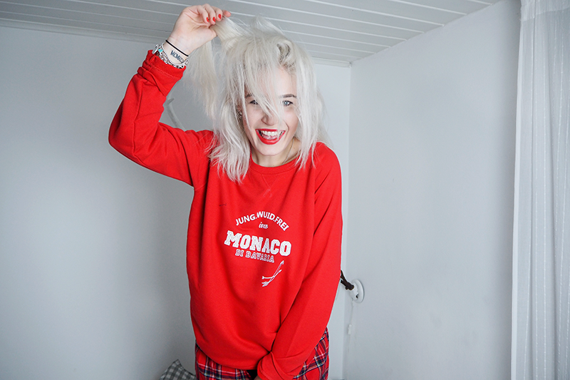 Normalerweise ist Rot ja eher nicht so meine Farbe, ich finde knalliges Rot irgendwie zu heftig zu meinen blonden Haaren. Dieser Pulli von IVXO Bavarian Couture hat es mir aber beim ersten Blick schon angetan und musste direkt bestellt werden! Er ist super angenehm zu tragen und passt auch noch perfekt zu meinen Lieblings-Schlafshorts! Ich habe mir den Pulli übrigens ein bisschen größer bestellt, da ich Oberteile immer am Liebsten richtig schön oversized trage. Ich bin absolut in Love mit meinem Monaco di Bavaria Sweatshirt! Im Online Shop gibt es noch einige weitere süße Sweater und Shirts - unbedingt mal vorbei schauen!